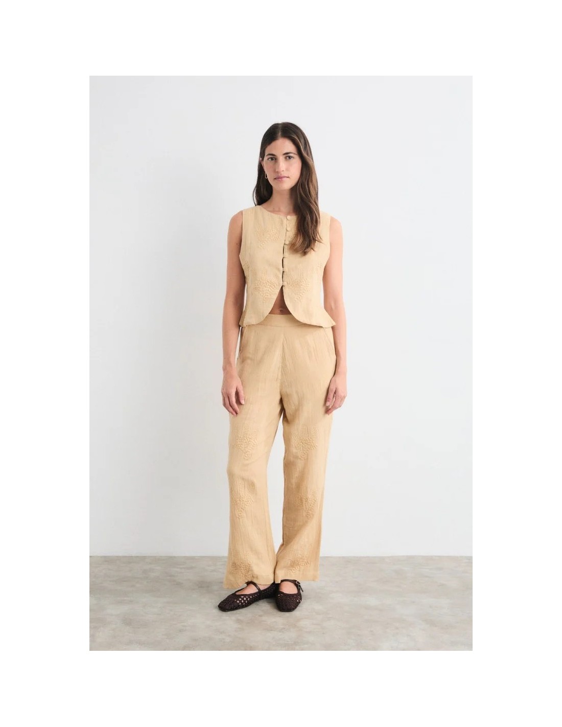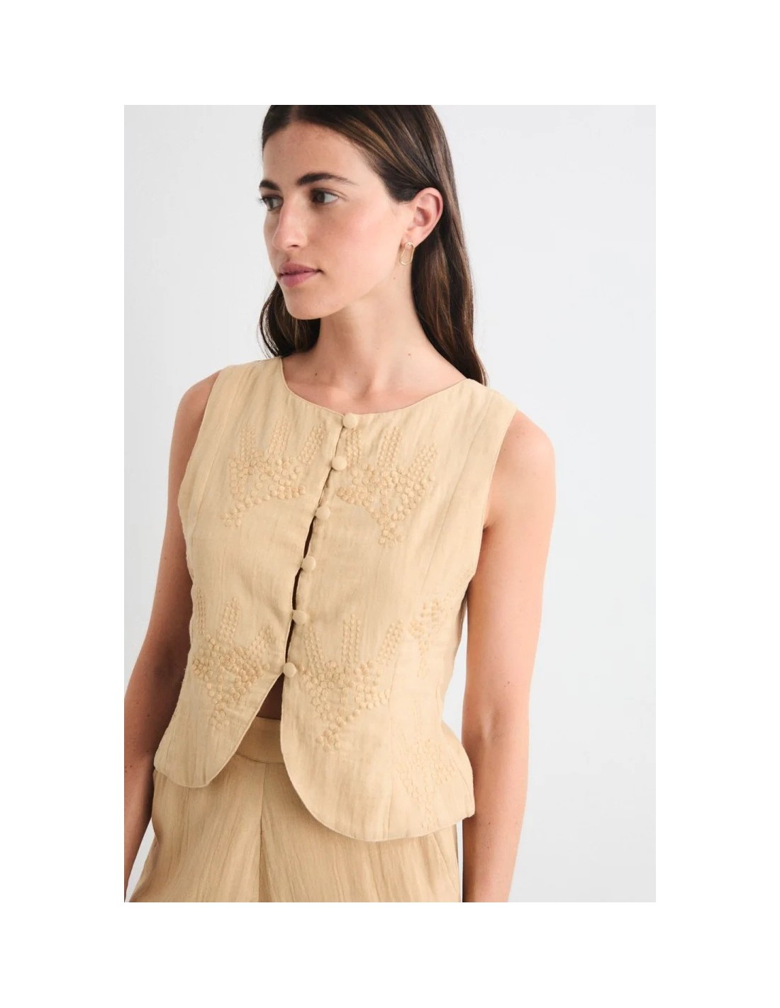 - Top sin mangas con bordados artesanales, botonadura forrada y bajo delantero redondeado.