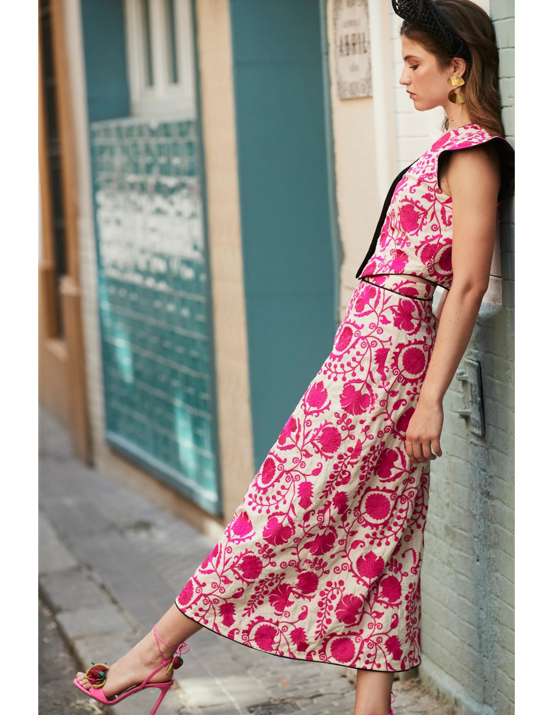 • Falda confeccionada en tejido bordado floral en tono fucsia y detalles de vivo negro en el bajo.