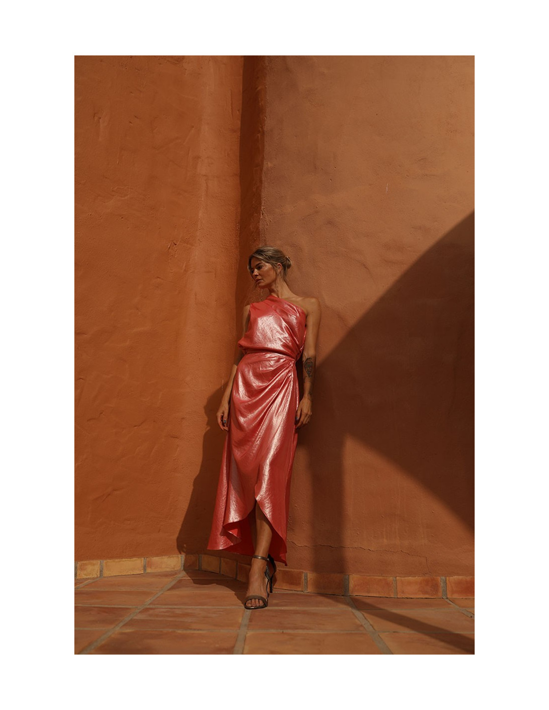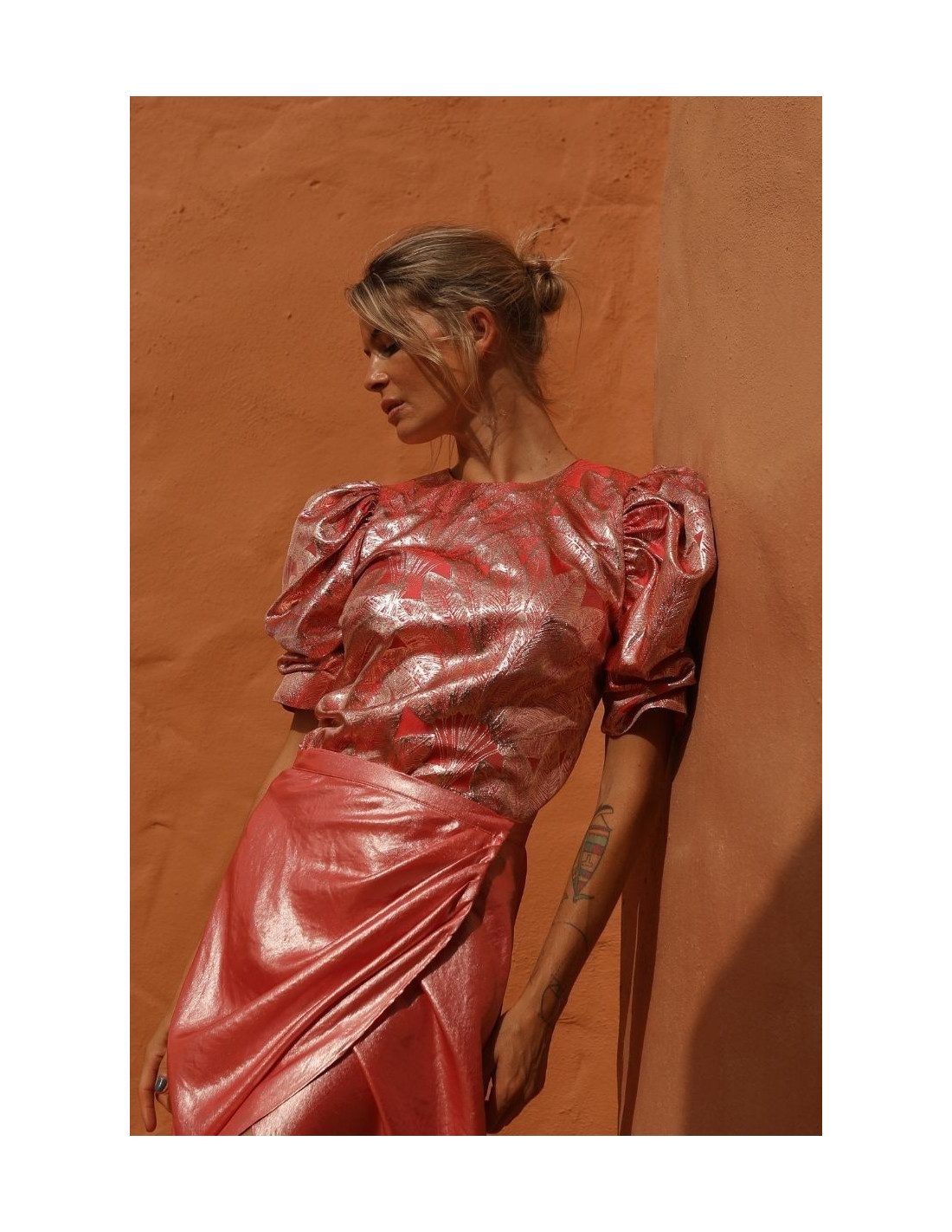 - Confeccionada con tejido de lamé, ligero y brillante en un precioso color coral.