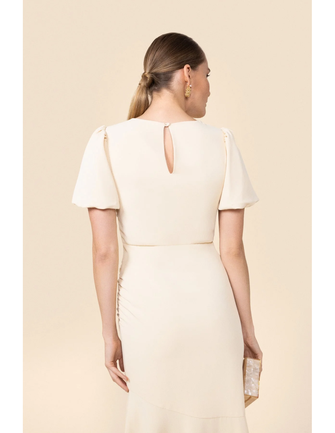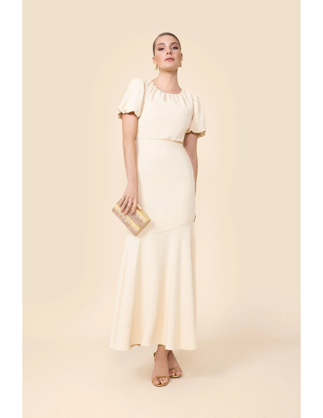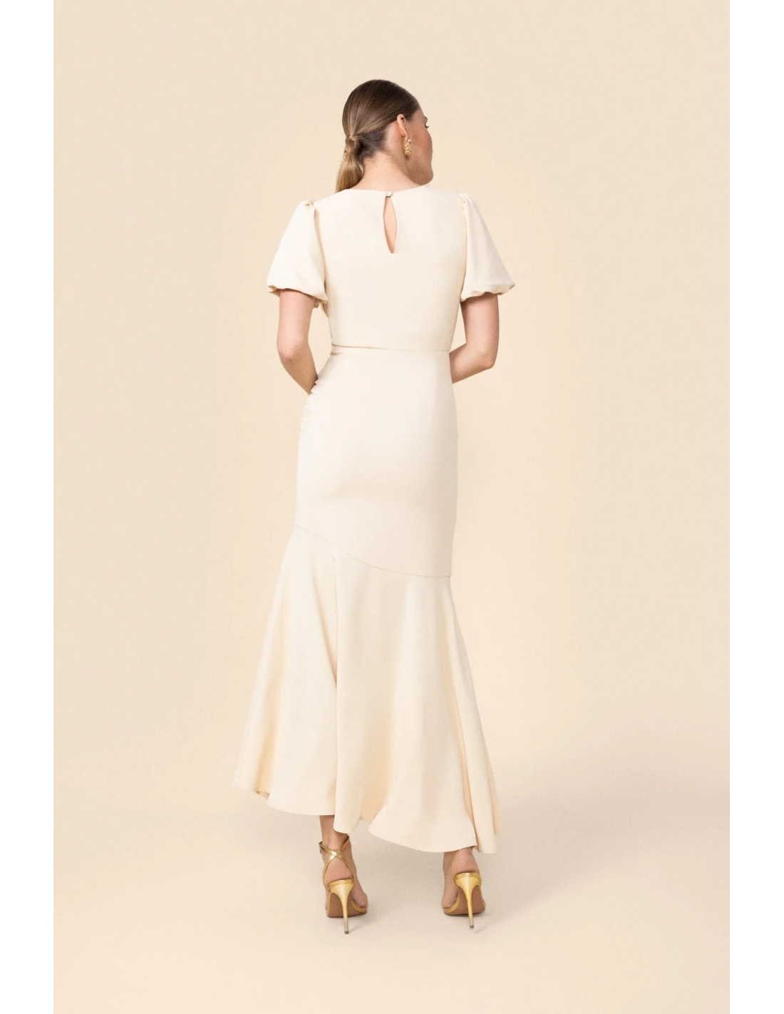 - Silueta de corte en la cintura y falda con corte al bies y vuelo.