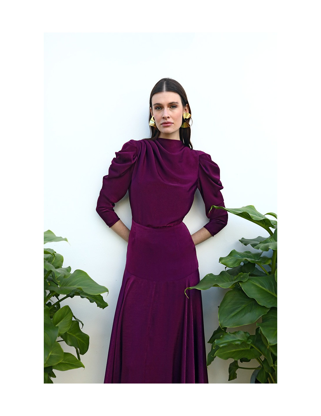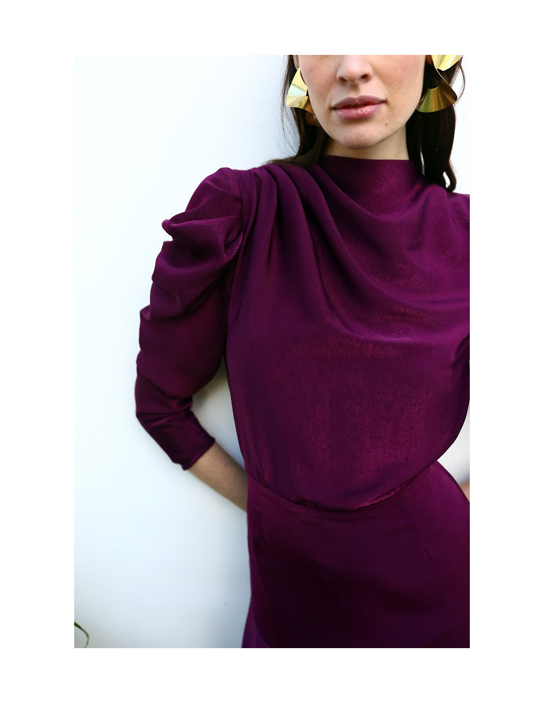- Escote desbocado con cuello a la caja y pliegues en el pecho.