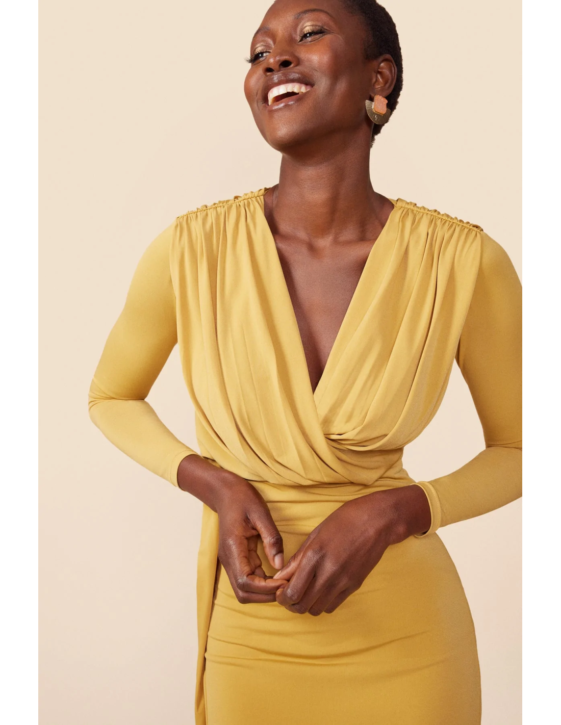 • Escote cruzado en V y detalle de pliegues frontales y en espalda.