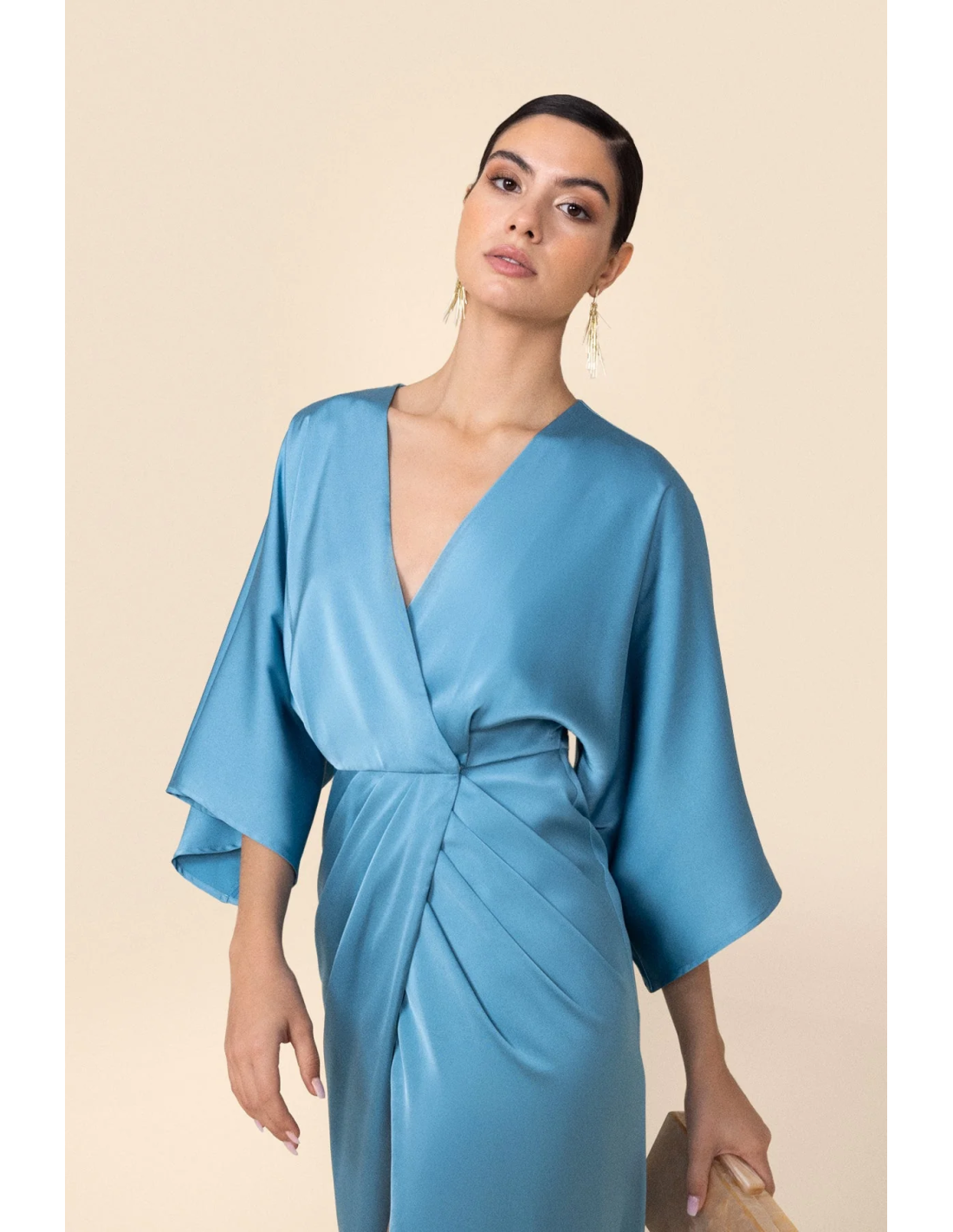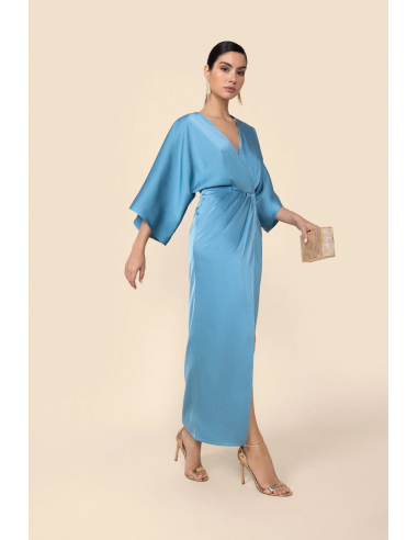 - Vestido largo de fiesta confeccionado en crepe saten en color azul cielo.