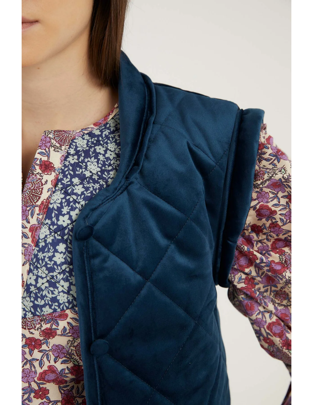 • Chaleco acolchado tipo crop confeccionado en un tejido de terciopelo color cobalto.