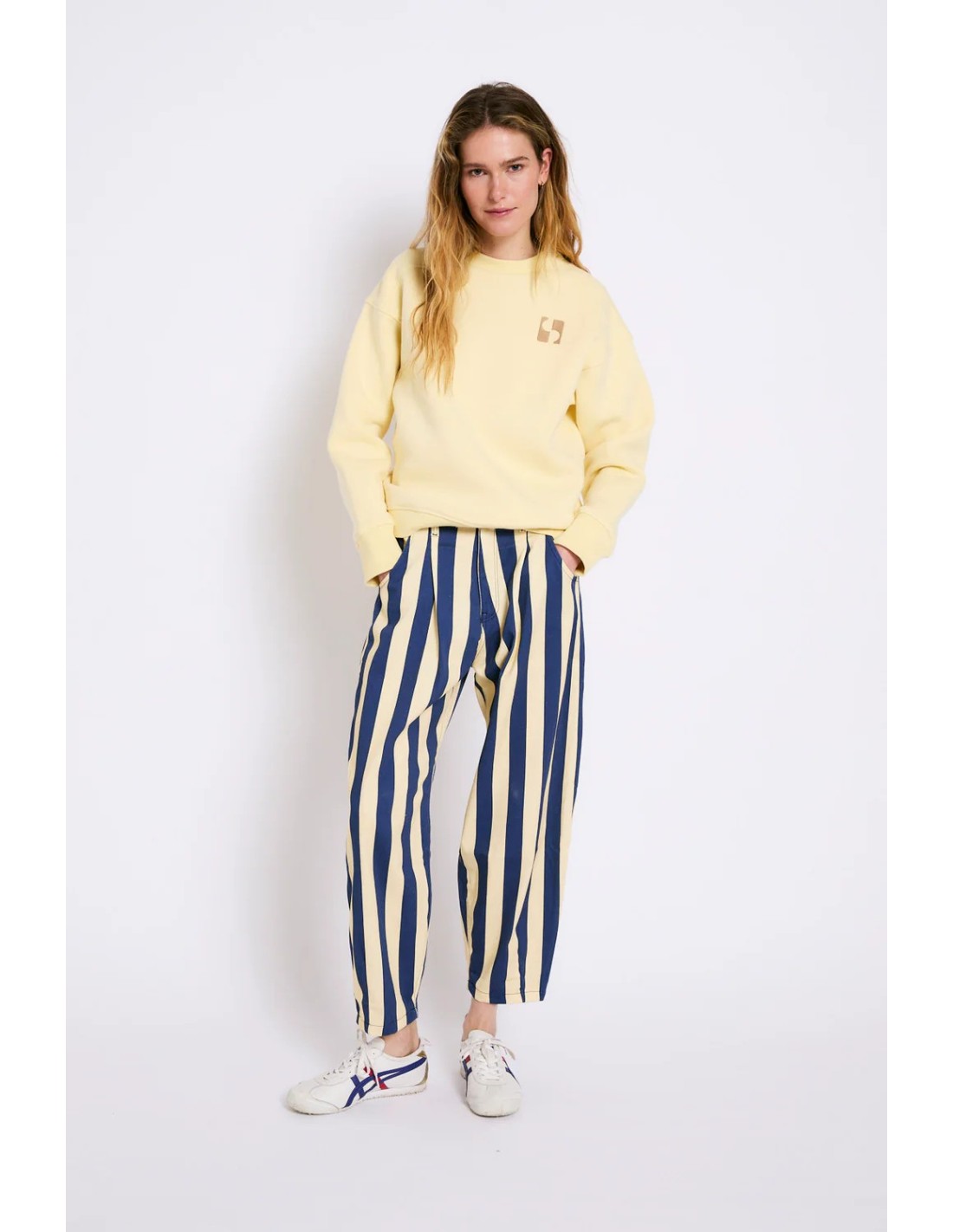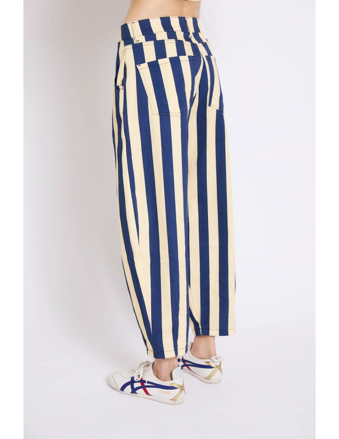 • Jeans de corte recto con estampado de rayas verticales en azul marino y crema.