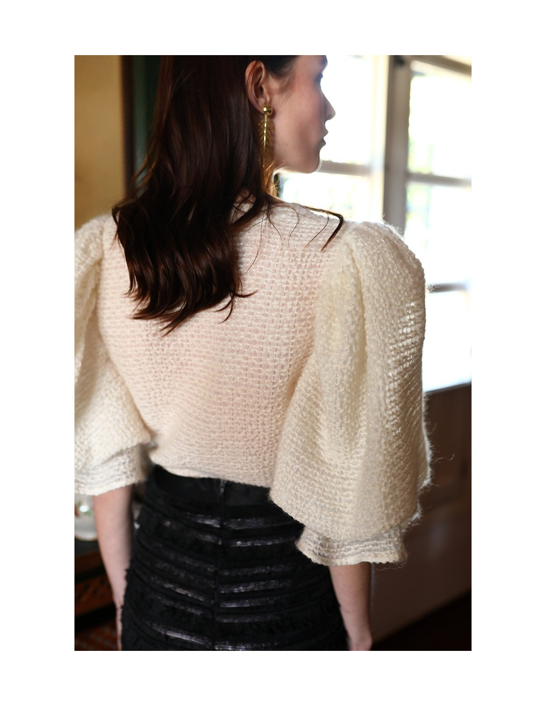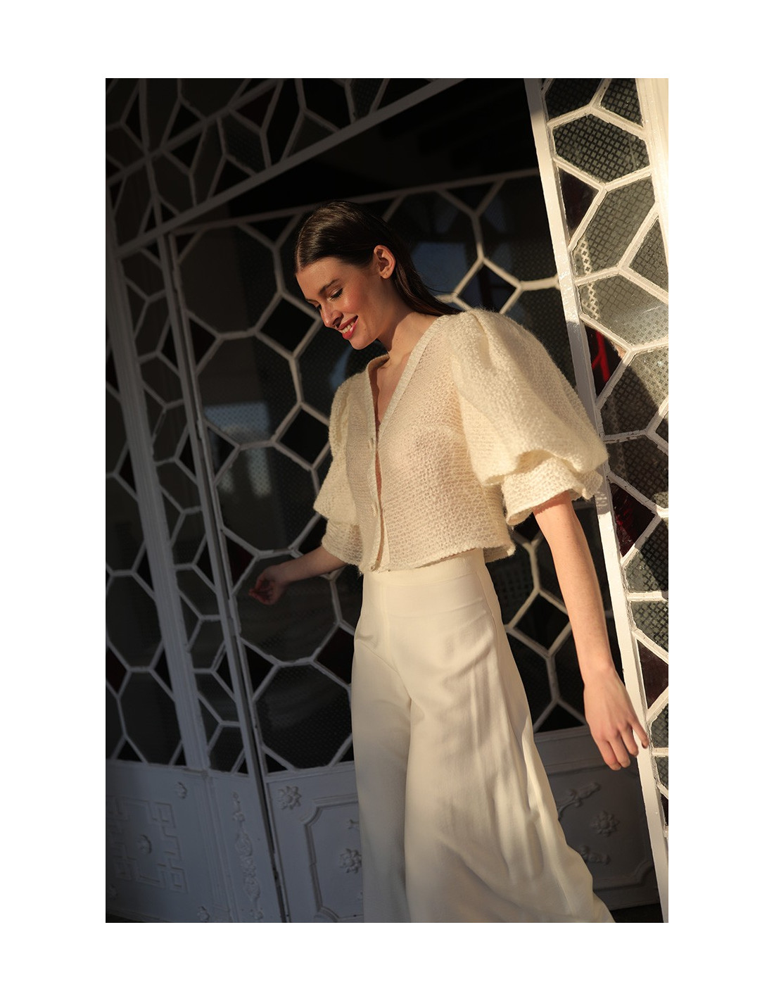 - Mangas cortas hasta el codo maxi abullonadas terminadas en elástico.