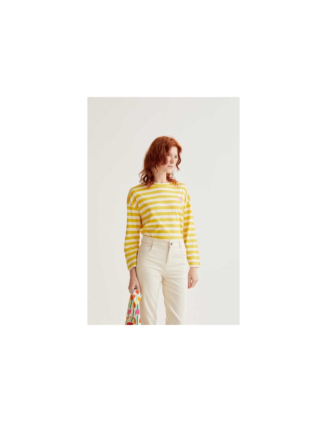 - Camiseta de tejido 100% algodón con estampado de rayas blanco y amarillo.