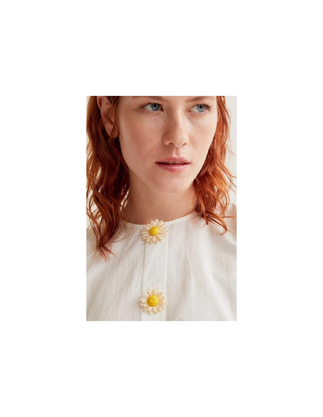 - Cierre frontal con botones ocultos con detalle floral.
