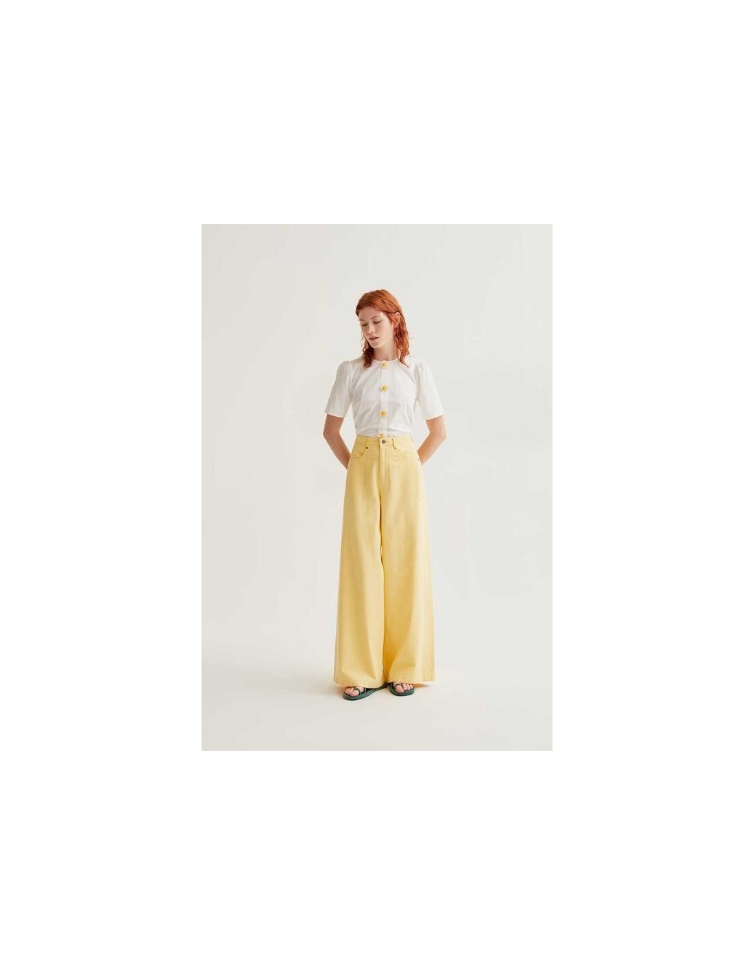 - Cuello redondo y manga corta ligeramente abullonada.