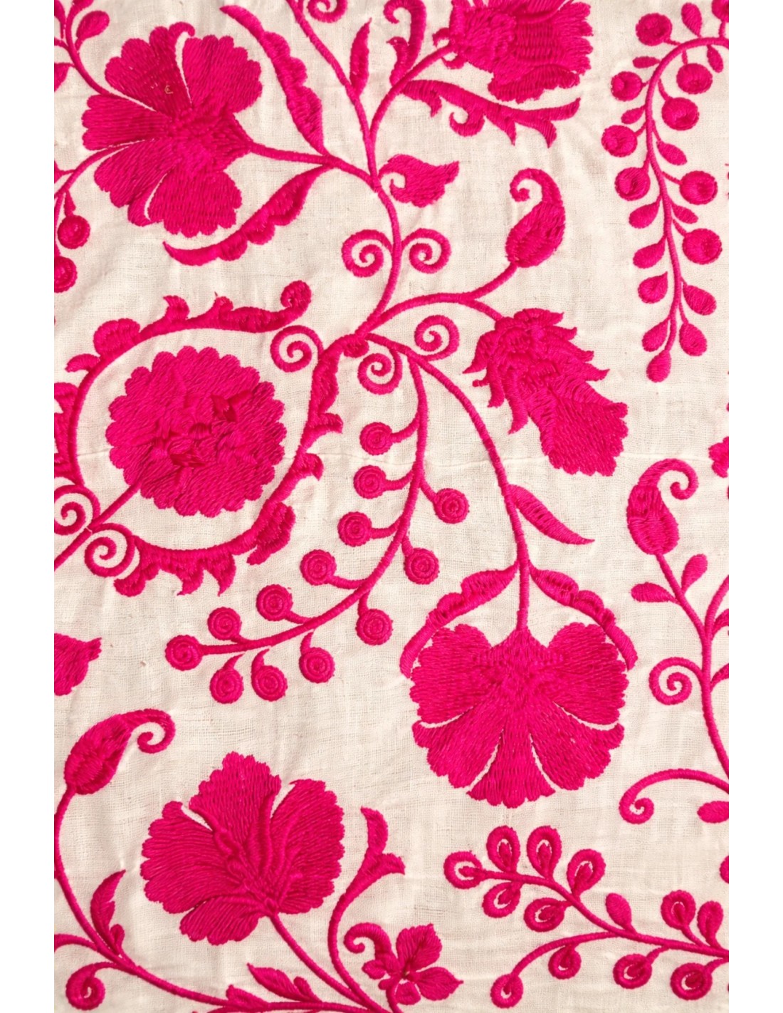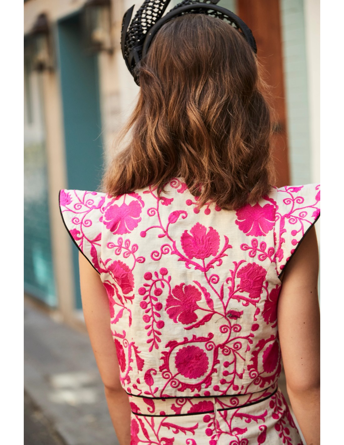 - Camisa en tejido bordado floral en color fucsia y detalles de vivo negro en contraste.