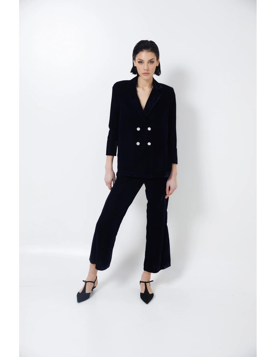 • Pantalón de tiro alto flare crop, confeccionado en tejido de terciopelo color azul marino.