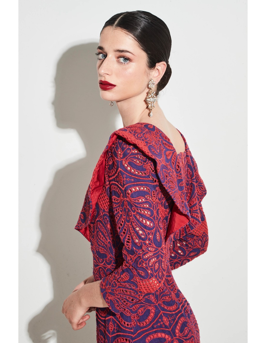 - Vestido bordado de corte recto con estampado ornamental en tonos rojo y azul